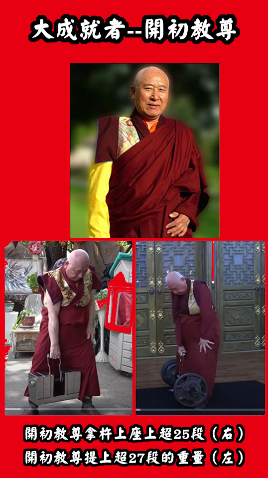 年近90歲的聖僧開初教尊用他三根手指頭已骨節折斷變形的右手,單手拿起了200磅金剛杵上基座,展顯了其上超十六段的聖力,遠超亞洲第一大力士,驚駭世人。
