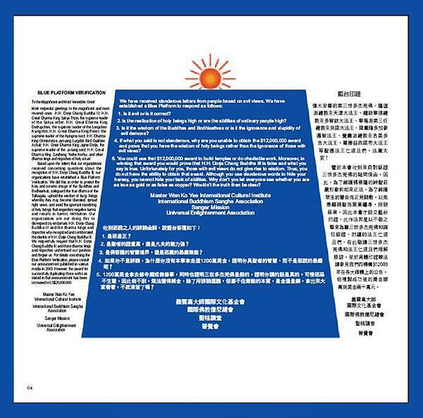 鑒於本會收到來自對認證三世 多杰羌佛的疑問信函,因此,為了維護佛菩薩的神聖莊嚴形象和如來正法,為了維護眾生的慧命而正見開敷,以免愚癡謗聖而黑業纏身,招致惡果,因此本會才設立 藍台印證,此作法非是以不敬之舉來為難三世多杰羌佛和諸位認證、附議的法王仁波且們,在此敬請三世多杰羌佛和法王仁波且們理解原諒。至於具體印證辦法請參 見我們四機構於2003年在各大媒體上的公告,但複製成功後的獎金提高到美金兩千萬元。
